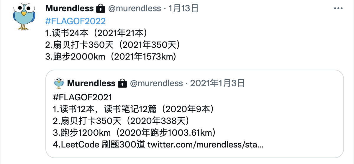 不积跬步,无以至千里。年读书24本需要平均每个月读两本书,再平均一下就是每双周读一本书,读书是为了用文字滋润自己的心灵,不被世俗干涸淹没;年跑量2000公里平均下来相当于月跑量167km,努力跑步是为了有更健康的体魄去践行长期主义;扇贝英语打卡350天则要求几乎不能间断,英文仍然是与世界交流的窗口,要自己保持阅读一手的资料能力。以上三个flag是2022年我对自己的最低要求。
