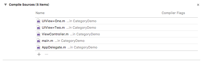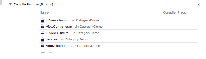 2018-05-18 15:23:13.379081+0800 CategoryDemo[2373:700484] 调用One分类的方法 - 将UIView+One.m移动到UIView+Two.m上面,编译顺序如下图时输出: