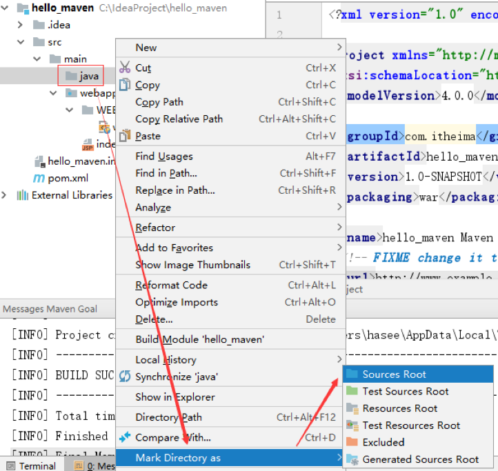 点击 OK 后,在新的文件夹 java 上右键 Make Directory as Sources Root