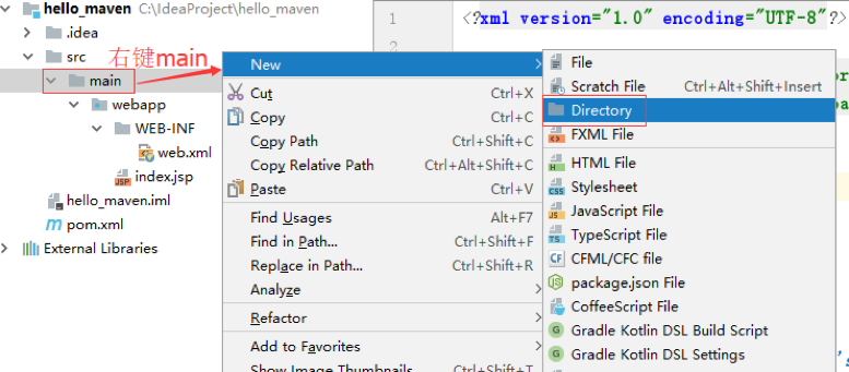 手动添加 src/main/java 目录,如下图右键 main 文件夹-New-Directory,创建一个新的文件夹命名为 java