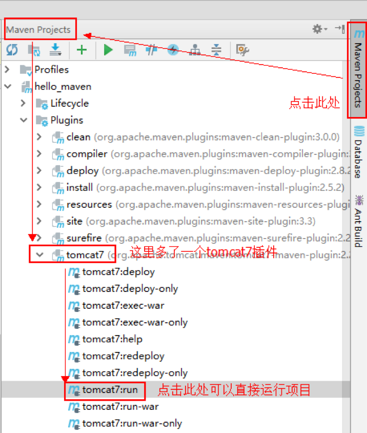 此时点击 idea 最右侧 Maven Projects, 就可以看到我们新添加的 tomcat7 插件 双击 tomcat7 插件下 tomcat7:run 命令直接运行项目