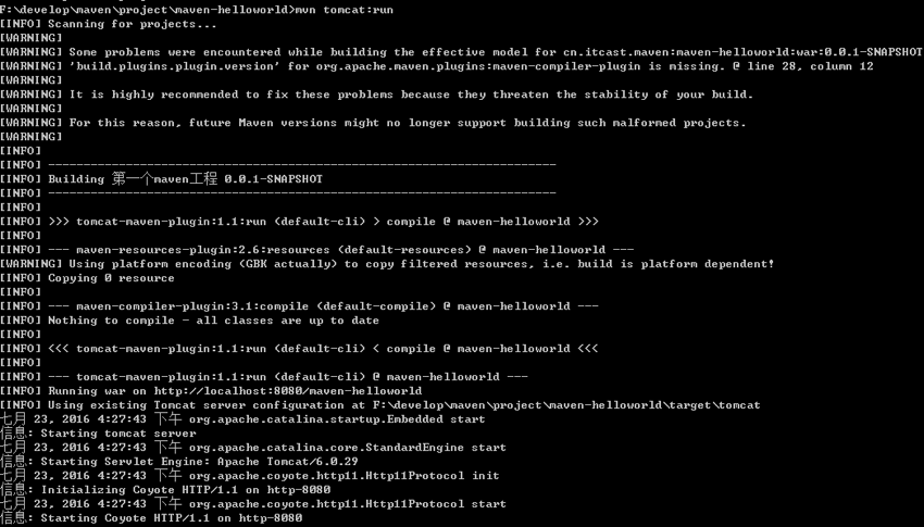 进入 maven 工程目录(当前目录有 pom.xml 文件),运行 tomcat:run 命令。