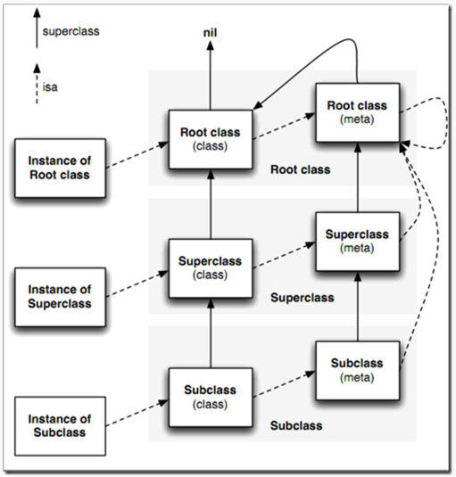 类的super_class指向其父类,而元类的 super_class 则指向父类的元类;元类的 super_class 链与类的super_class链平行,所以类方法的继承与实例方法的继承也是平行的。而根元类(root class’s metaclass)的 super_class指向根类(root class),这样整个指针链就链起来了。