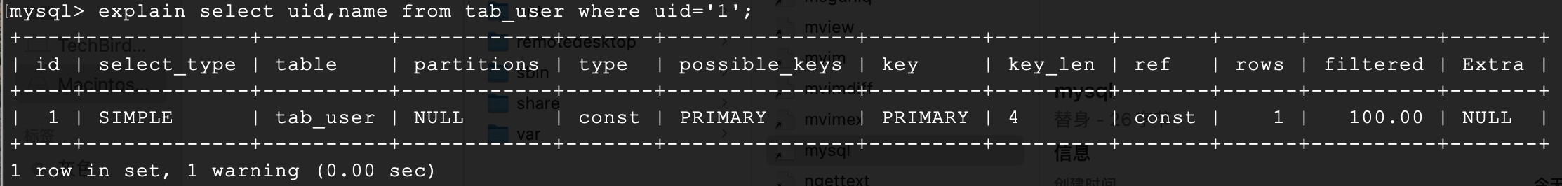 explain select uid,name from tab_user where uid='1';