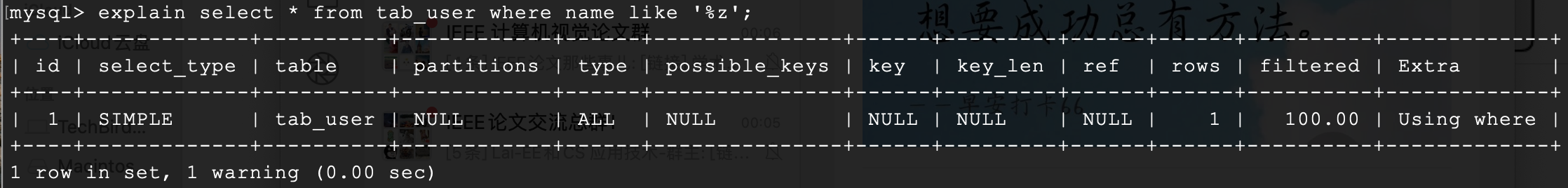这条带有 like 查询的 SQL 语句,没有用到 tab_user 表中的 index_name 索引。